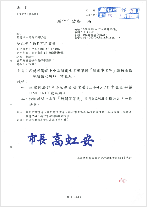 函轉經濟部中小及新創企業署舉辦「新創事業獎」選拔活動,敬請協助周知,請查照。
