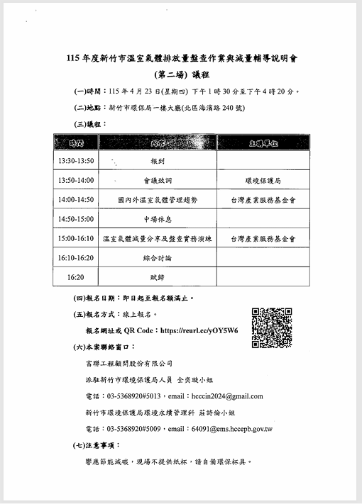 本局訂於115年4月23日(星期四)舉案第二場「溫室氣體排放量盤查作業與減量輔導說明會」,請協助轉知轄內企業、公司及工廠等踴躍報名參加,請查照。