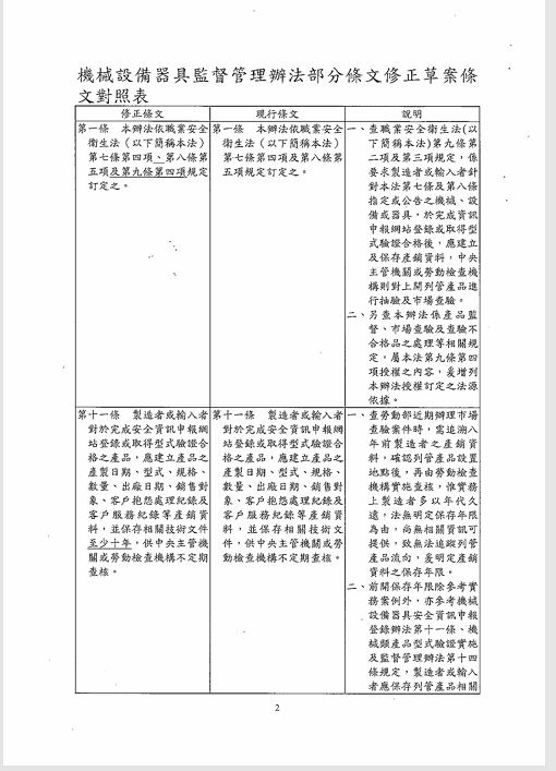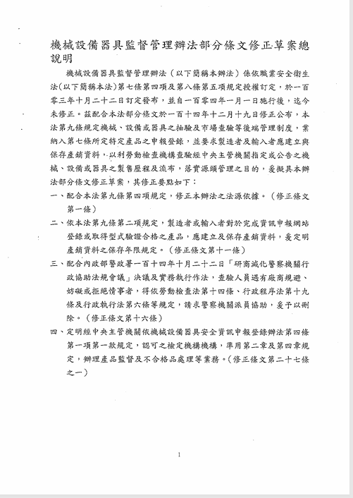 函轉勞動部於中華民國115年4月14日以勞職授字第1150251345號令修正發布「機械設備器具監督管理辦法」部分條文修正草案,如有任何意見或修正建議,可於公告次日起30日內提送勞動部,請查照並轉知所屬會員。 2026.04.20