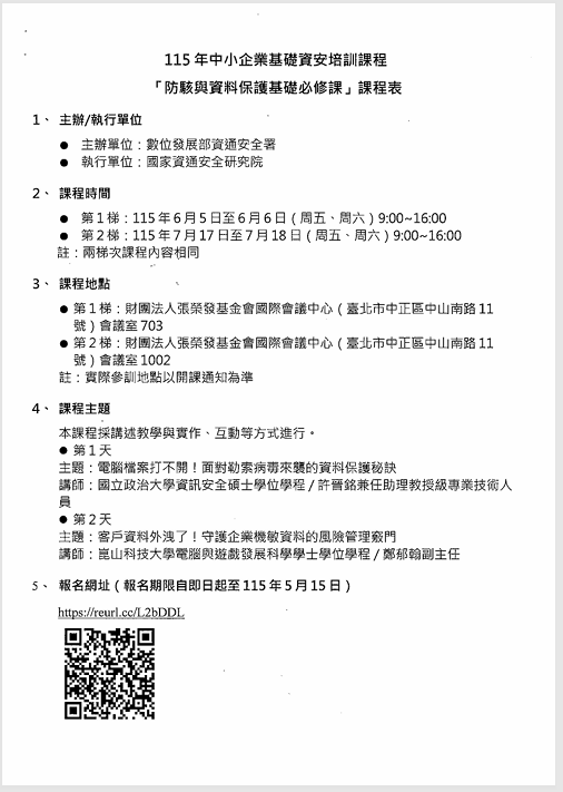 函轉數位發展部資通安全署「115年中小企業基礎資安培訓課程」活動資訊,請協助轉知中小企業踴躍報名參與,請查照。