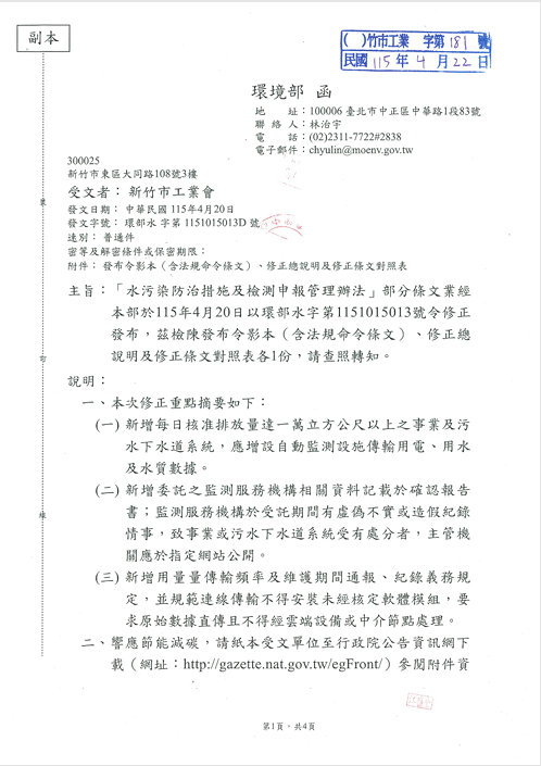 「水汙染防治措施及檢測申報管理辦法」部分條文業經本部於115年4月20日以環部水字第1151015013號令修正發布,茲檢陳發布令影本(含法規命令條文)、修正總說明及修正條文對照表各1份,請查照轉知。 2026.04.23