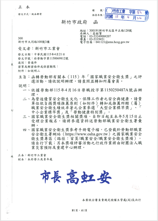 函轉勞動部有關本(115)年「國家職業安全衛生獎」之評選活動,請依說明段辦理,請查照並轉知所屬會員,。