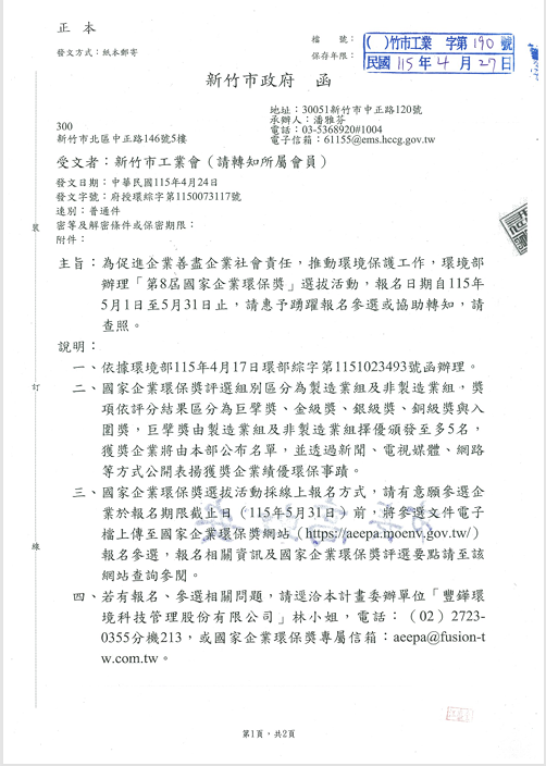 為促進企業善盡企業社會責任,推動環境保護工作,環境部辦理「第8屆國家企業環保獎」選拔活動,報名日期自115年5月1日至5月31日止,請惠予踴躍報名參選或協助轉知,請查照。